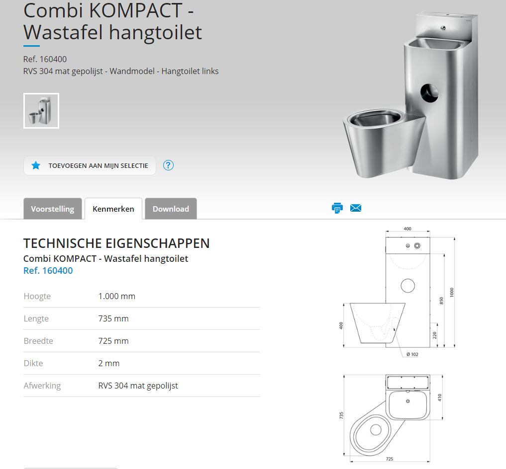 160400 KOMPACT RVS closet-/wastafelcombinatie links model met hang closet.