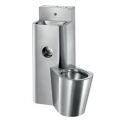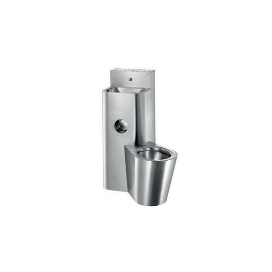 Combi wastafel en hangtoilet links met ingebouwde toiletpapierhouder. Wandmodel met 3 inspectieluiken, 2 op de zijkant en 1 op de bovenkant, met anti-diefstal schroeven TORX. Bacteriostatisch RVS 304. Gesatineerde afwerking. Dikte RVS van het blok: 2 mm. Afgeronde hoeken en randen voor een betere veiligheid. Glad oppervlak voor een gemakkelijke reiniging. Geschikt voor gebruik in gevangenissen, politiekazernes... De WC is volledig gelast aan de wastafel, geen schroeven: vergemakkelijkt het reinigen en verhindert het verbergen van objecten. Geleverd met een zelfsluitende wastafelkraan: onschendbare drukknop in RVS met anti-blokkeerveiligheid, zelfsluiting na 7 seconden, M1/2". WC uitgerust met een zelfsluitende kraan, zelfsluiting na 7 seconden, M3/4". Water inlaat: wastafel M 1/2", WC M3/4". Geïntegreerde horizontale afvoer Ø 100 mm. Geleverd met sifon voor wastafel. Vereenvoudigde plaatsing: één enkele afvoer voor WC en wastafel, water inlaat en afvoer reeds gekoppeld. Gewicht: 36 kg.