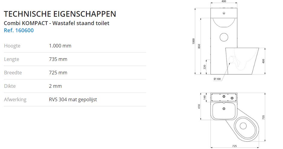 160600 KOMPACT RVS closet-/wastafelcombinatie rechts model met staand closet.