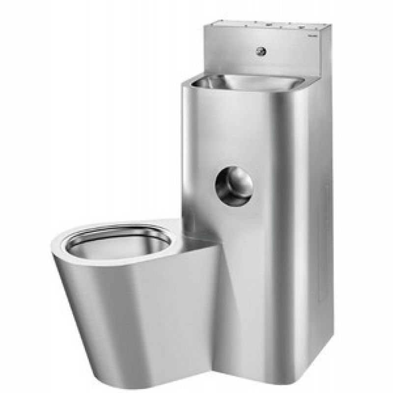 Combi wastafel en hangtoilet links met ingebouwde toiletpapierhouder. Wandmodel met 3 inspectieluiken, 2 op de zijkant en 1 op de bovenkant, met anti-diefstal schroeven TORX. Bacteriostatisch RVS 304. Gesatineerde afwerking. Dikte RVS van het blok: 2 mm. Afgeronde hoeken en randen voor een betere veiligheid. Glad oppervlak voor een gemakkelijke reiniging. Geschikt voor gebruik in gevangenissen, politiekazernes... De WC is volledig gelast aan de wastafel, geen schroeven: vergemakkelijkt het reinigen en verhindert het verbergen van objecten. Geleverd met een zelfsluitende wastafelkraan: onschendbare drukknop in RVS met anti-blokkeerveiligheid, zelfsluiting na 7 seconden, M1/2". WC uitgerust met een zelfsluitende kraan, zelfsluiting na 7 seconden, M3/4". Water inlaat: wastafel M 1/2", WC M3/4". Geïntegreerde horizontale afvoer Ø 100 mm. Geleverd met sifon voor wastafel. Vereenvoudigde plaatsing: één enkele afvoer voor WC en wastafel, water inlaat en afvoer reeds gekoppeld. Gewicht: 36 kg.
