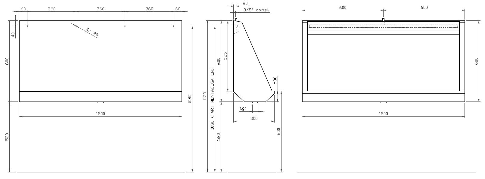015P1200 RVS 304 wandurinoir 1200mm. Toevoer bovenzijde. Afvoer midden.
