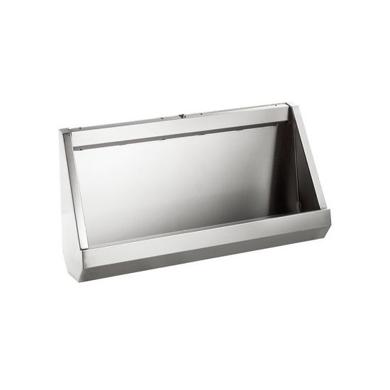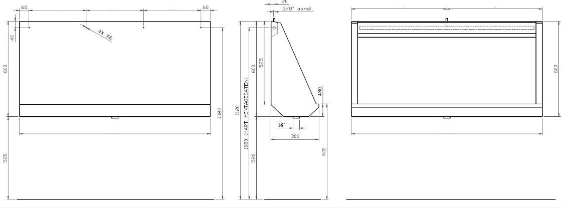 RVS urinoir, wandmontage. Afm. op maat tussen 1200-1500mm. Watertoevoer aan bovenzijde. Incl. afgedekte sproeipijp en 1,5" zelfsifonerende plug met bolrooster.