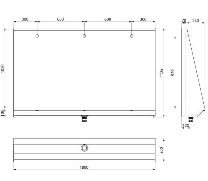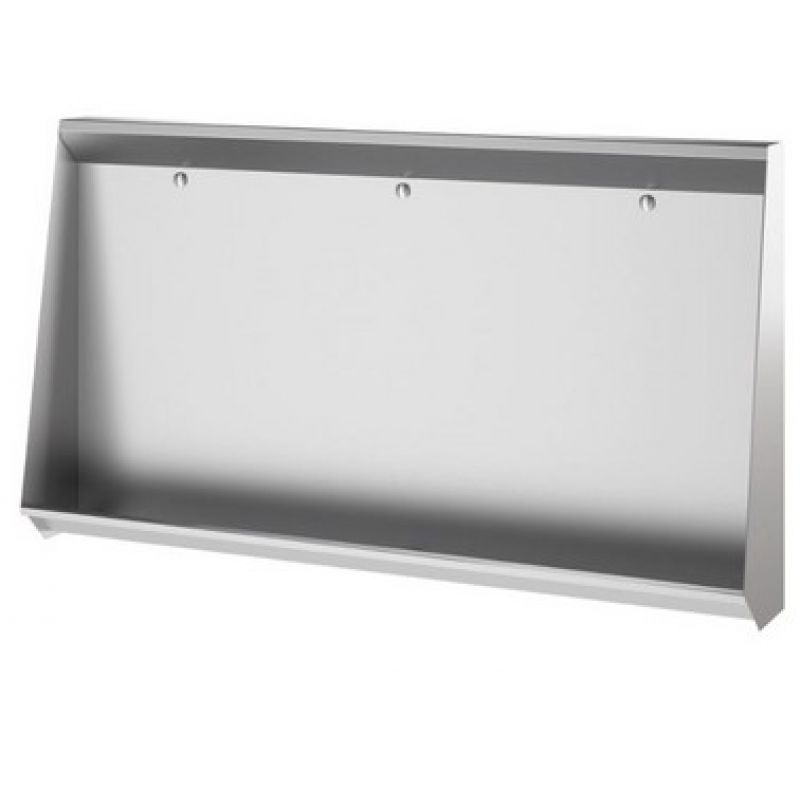 Collectief staand urinoir, in te bouwen. Bacteriostatisch RVS 304. Mat gepolijste afwerking. Dikte RVS: 1,2 mm. Water inlaat achteraan. Geleverd met 3 RVS sproeistukken. Waterbesapring: optimale spoeling met een debieet van 0,1 l/sec per post, of 0,3 liter per gebruik. Leegloop 1"1/2. Zonder sifon. Gewicht: 34 kg.