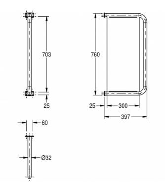 RVS schaamschot / tussenschot 760x397x60mm frame van profielbuis 32mm rond met 2 wandflenzen incl RVS schroeven en pluggen Plaatdikte 1,5mm