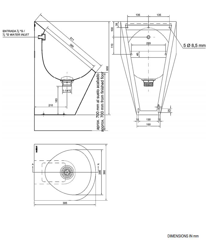 RVS 304 komurinoir afm. 600x360x395mm. Achter inlaat. Geschikt voor inbouw spoelsysteem. Satin finish. Toever 1/2" dr. en afvoer 1,25".