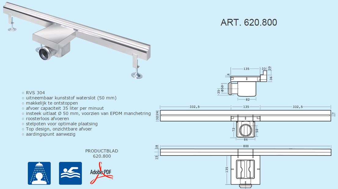 RVS 304 vloergoot uitw. 800 t/m 1000mm. uitneembaar kunststof waterslot / insteek uitlaat 50mm rond / makkelijk te ontstoppen / afvoer capaciteit 35 liter per minuut OP AANVRAAG
