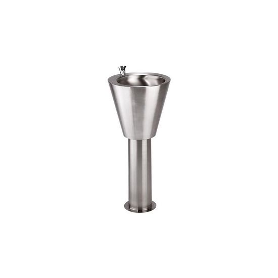 RVS vrijstaande wasfontein, conisch op voet met kraangat. Afm. 415 mm diam x850mm. De komwastafel is inwendig 260x110mm. Incl. afvoer met wandoverloop/. Excl. kraan. Conisch model waarbij de zuil is voorzien van een montageflens. Geschikt voor binnenruimten.