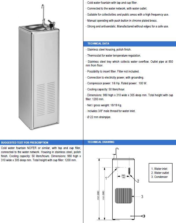 RVS 304 drinkfontein staand model met drinkventiel. Afm. 980x310x305mm, met een ondiepe schaal. Geschikt voor binnenruimten. Optie: flessenvuller