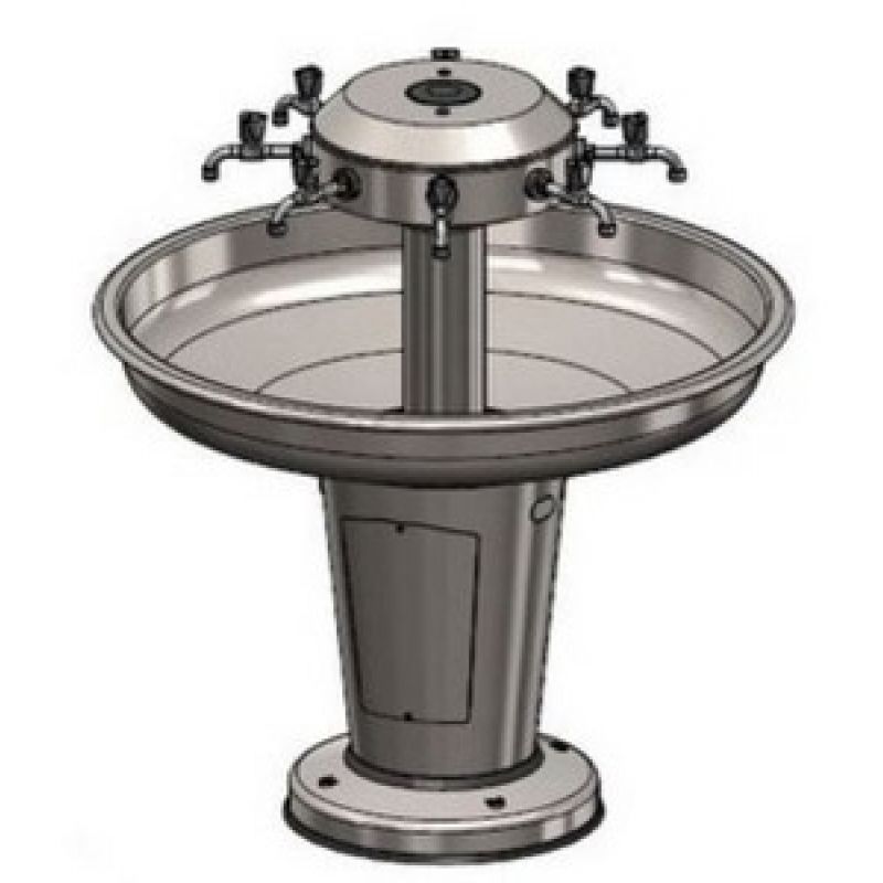 Sanispray RVS wasfontein met toevoerleiding met verdeelkop met koud of voorgemengd water. Kranen ook leverbaar in andere maten en uitvoeringen, 1370, 1130, 995mm voor resp. 8, 8, 6 personen ook een wandmodel in 5, 4 en 3 persoons.