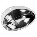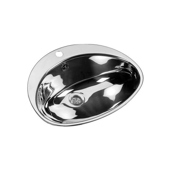 Ovale RVS wastafel met kraangat voor opleg. Incl. klemmen en wandoverloop met 1,5" afvoerplug. In- en uitwendig hoogglans. Afm. 570x480x155mm.