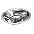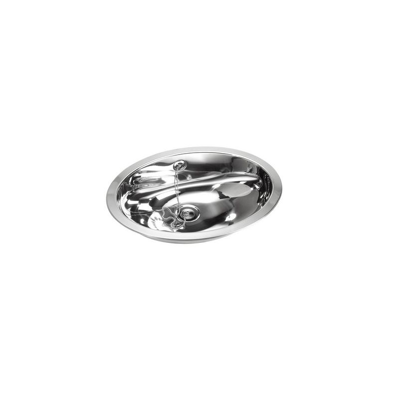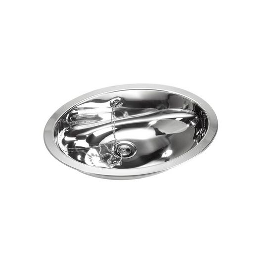 Ovale RVS wastafel voor opleg. Incl. 1,25" afvoerplug met wandoverloop. Excl. klemmen. Afm. uitw. 510x390x160mm. In- en uitwendig hoogglans.