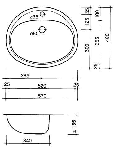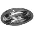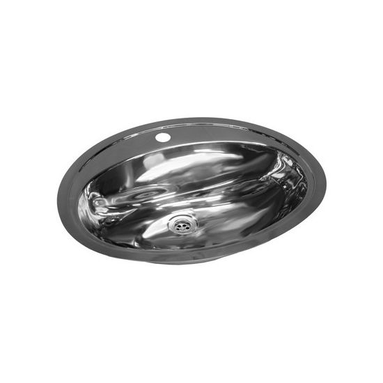 Ovale RVS wastafel met kraangat voor vlakke inleg. Incl. klemmen, zonder wandoverloop. Met 1,5" afvoerplug. In- en uitwendig hoogglans. Afm. 570x480x155mm.