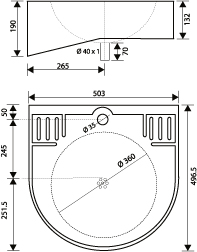 RVS design wastafel met geïntergreerde zeepbakjes en consoles en 1,25" afvoerplug. Met kraangat. Afm.500x490 mm. Bakafm. 360mm diam x145mm diep.
