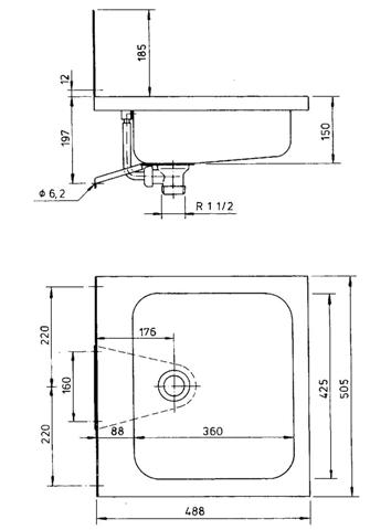 RVS Wastafel voor wandmontage met 1,5" afvoerplug, overloop, stop en ketting, 1 middenconsole en spatplaat 185x505 mm. Met kraangat. Afm. 505x488x150mm.