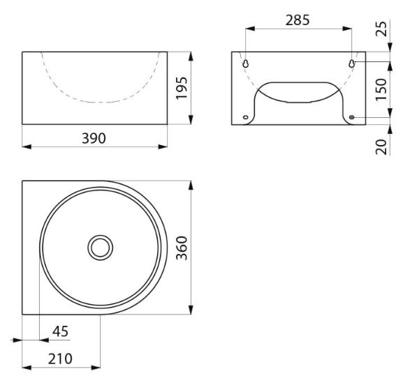 wastafel in RVS 304 360x390x200mm met ronde waskom inw. 320mm. Incl. plug ZO. Geschikt voor wandmontage.