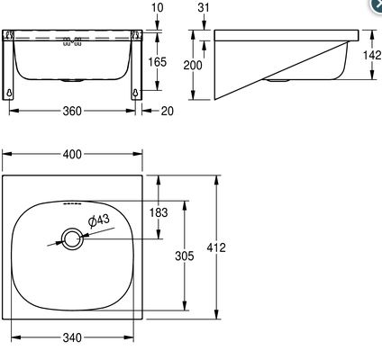 RVS 304 wastafel voor wandmontage uitw. Afm. 400x412x200mm, inw. 420x320x170mm. Incl. 1,5" afvoerplug.