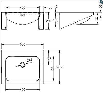 WT500A RVS 304 wastafel wandmontage Afm. 500x402x200mm