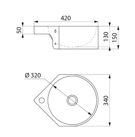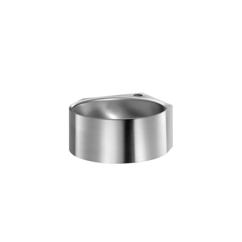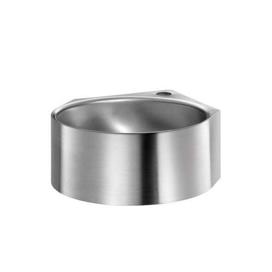 Wastafel te bevestigen aan de muur in een hoek (hoek van 90°). Binnendiameter van de wastafel: 320 mm. Sober en strak design. Bacteriostatisch RVS 304. Gesatineerde afwerking. Dikte RVS: 1,2 mm. Onscherpe afwerking. Met kraangat Ø 35 in het midden. Geleverd met afvoer 1"1/4. Zonder overloop. Bevestigingen meegeleverd. CE keurmerk. Conform de norm EN 14688. Gewicht: 4 kg.