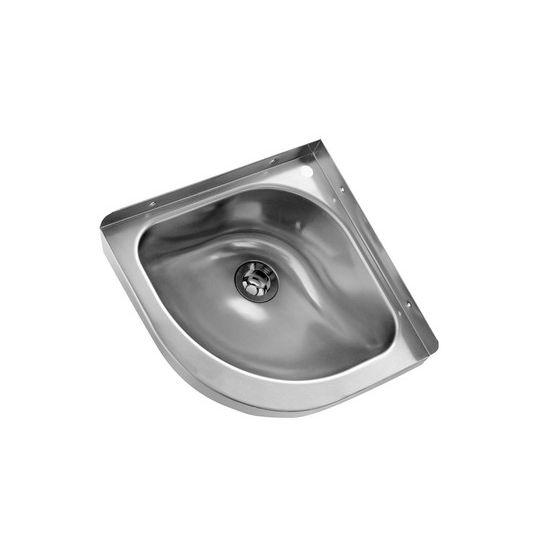 RVS hoekwastafel 360x360mm. Uitw. afm. 360x360x170mm met 1,5" afvoerplug. Met kraangat mogelijk!