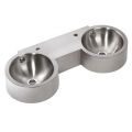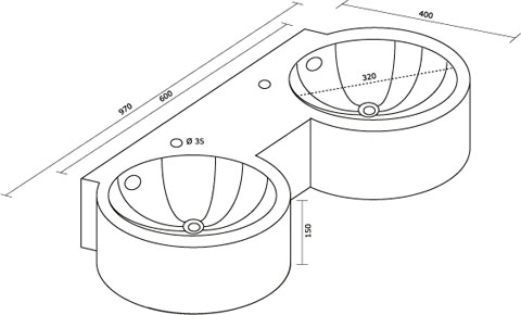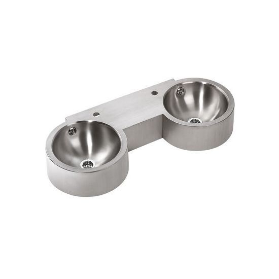 RVS Dubbele waskom DUETO voor wandmontage. Satin finish, incl. kraangaten 35mm. Incl. 1,25" afvoerpluggen met overloop.
