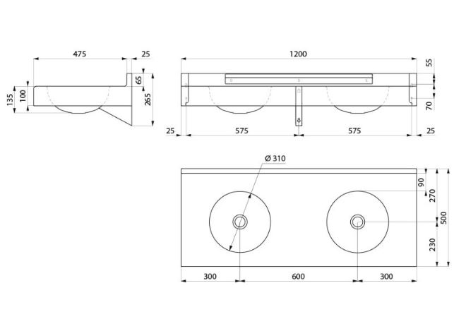 Wastafel 2 plaatsen, te bevestigen aan de muur, 1200x500mm. Met opstaande rand om de muur te beschermen en de hygiëne te verbeteren. Binnendiameter van de wastafels: 310 mm. Bacteriostatisch RVS 304. Mat gepolijste afwerking. Dikte RVS: 1,5 mm. Afgeronde vorm. Zonder kraangat. Geleverd met afvoer 1 1/4". Zonder overloop. Geleverd met montagebeugels en bevestigingen. CE keurmerk. Conform de norm EN 14688.