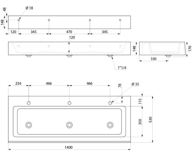 MINERALCAST collectieve wastafel wandmodel afm. 1400x570x148 mm. Met kraangat Ø 35 in het midden