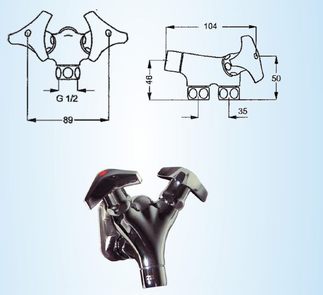 Muurmodel voor warm / koud of voorgemengd water tbv Intersan wastroggen Aansluiting koud (blauw) boven en warm (rood) onder