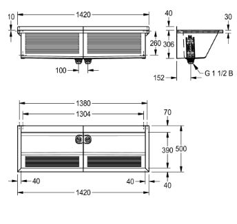RVS dubbele wastrog afm. uitw. 1420x500mm met 2 bakken, inw. 670x390x310mm, incl. 1,5" afvoerpluggen, kunststof standpijpen en vuilroosters.