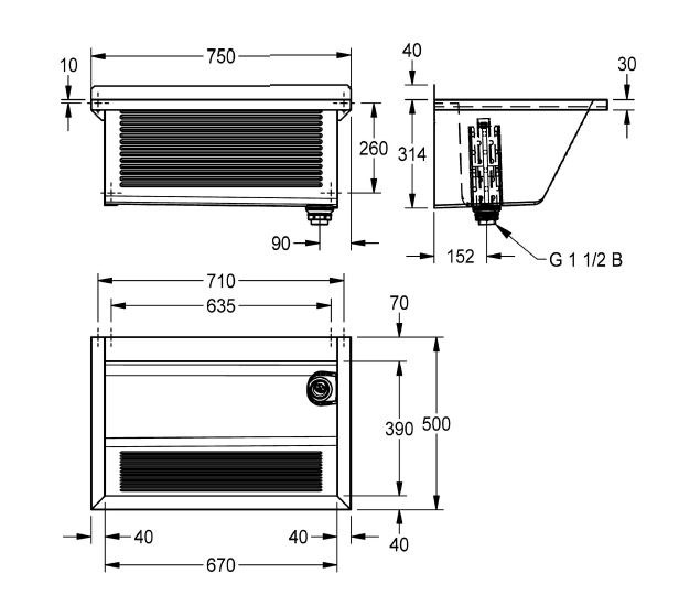 RVS wastrog, afm. uitw. 750x500mm, inw. 670x390x310mm, incl. 1,5" afvoerplug, kunststof standpijp en vuilrooster. Afvoer rechts.