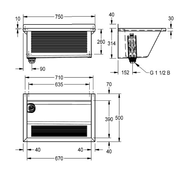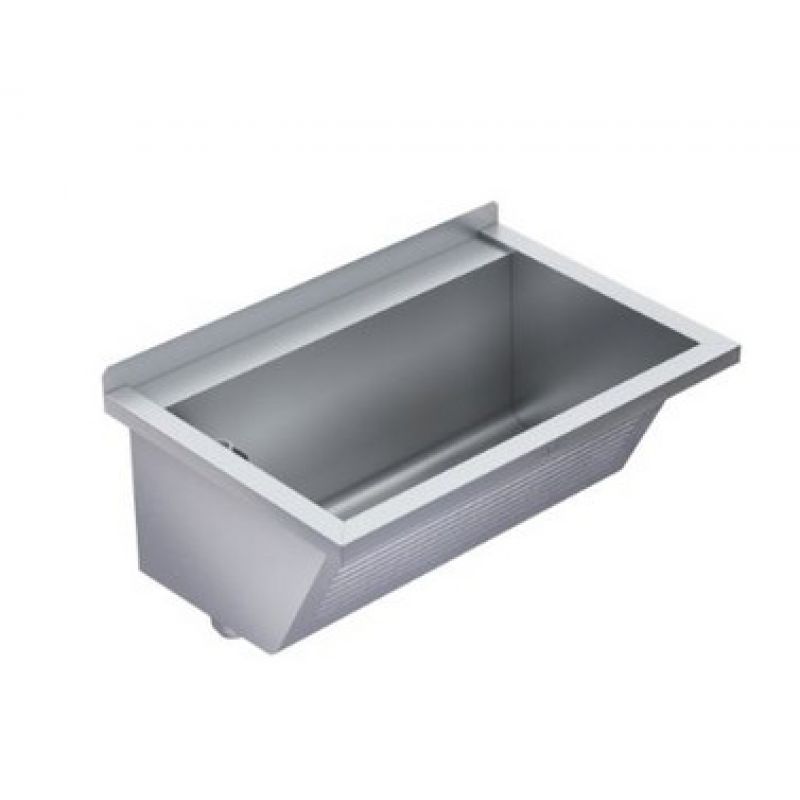 RVS wastrog, afm. uitw. 750x500mm, inw. 670x390x310mm, incl. 1,5" afvoerplug, kunststof standpijp en vuilrooster. Afvoer links.
