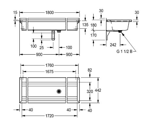 PL18T RVS 304 wasgoot 1800x442mm afvoer midden, incl. plug. Met kranenbank