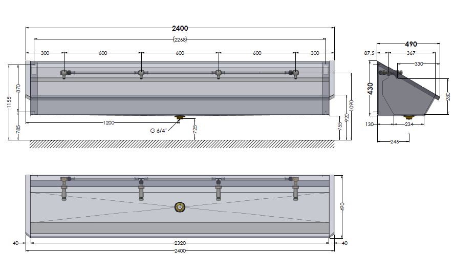 1.0-4-M3 RVS 304 Muurwastrog 2400mm 4 pl., 1 leiding, zelfsluitende kranen