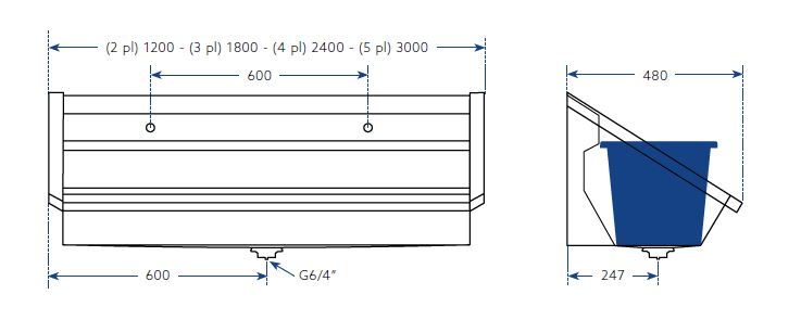 TM4CR RVS Wastrog met 1 toevoerleiding voor koud of voorgemengd water met voorgemonteerde KRAAN (PK10). Incl. afvoerplug 6/4" Toevoer standaard rechts, optie: links. 2400mm 4 personen