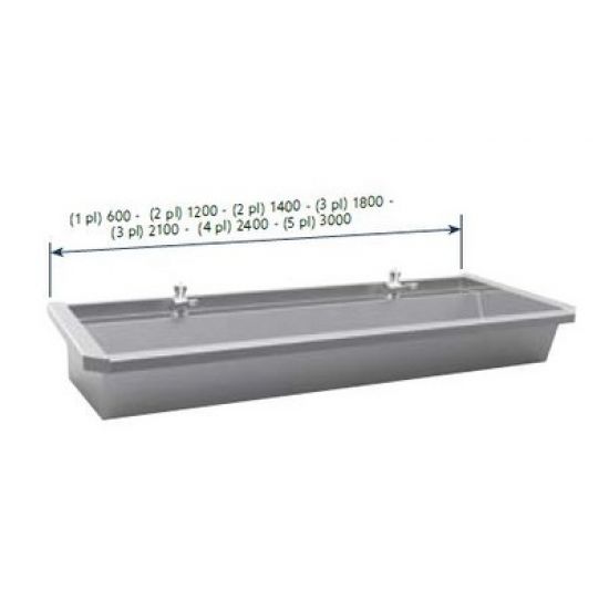 TM2AZ RVS Wastrog met 1 toevoerleiding voor koud of voorgemengd water met voorgemonteerde zelfsluitende kranen. Incl. afvoerplug 6/4". Toevoer standaard rechts, optie: links. Leverbaar in de maten 1200, 1800, 2400, 3000mm voor resp. 2, 3, 4 of 5 personen