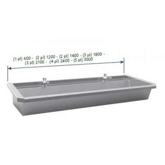 RVS Wastrog met 1 toevoerleiding voor koud of voorgemengd water met voorgemonteerde zelfsluitende kranen (P2401). Incl. afvoerplug 6/4". Toevoer standaard rechts, optie: links. Leverbaar in de maten 1200, 1800, 2400, 3000mm voor resp. 2, 3, 4 of 5 personen