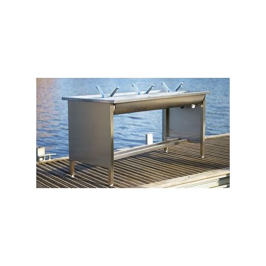 RVS Wastrog voor wandmontage met spatplaat. 1,5" afvoerplug in het midden en consoles. Afm. ...x...mm. Uitvoering type B geschikt voor kranen op de wastrog, ...mm diep.