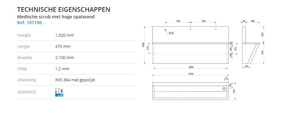 Medische scrub met hoge spatwand. L. 2.100 mm, 3 plaatsen. Met 3 kraangaten Ø 22. Bacteriostatisch RVS 304. Mat gepolijste afwerking. Dikte RVS: 1,2 mm. Glad oppervlak en de randen zijn afgerond voor een gemakkelijke reiniging. Geschikt voor gebruik in ziekenhuizen of zorginstellingen. Spatrand van 450 mm om de muur te beschermen tegen spatten en de hygiëne te verbeteren. Afloop rechts. Zonder overloop. Bevestigingen meegeleverd. Gewicht: 48,5 kg.