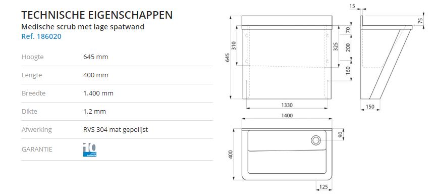 Medische scrub met lage spatwand. L. 1.400 mm, 2 plaatsen. Zonder kraangat. Bacteriostatisch RVS 304. Mat gepolijste afwerking. Dikte RVS: 1,2 mm. Glad oppervlak voor een gemakkelijke reiniging. Geschikt voor gebruik in ziekenhuizen of zorginstellingen. Afloop rechts. Zonder overloop. Bevestigingen meegeleverd.