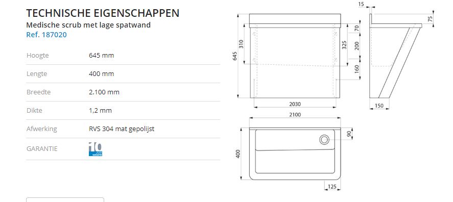 Medische scrub met lage spatwand. L. 2.100 mm, 3 plaatsen. Zonder kraangat. Bacteriostatisch RVS 304. Mat gepolijste afwerking. Dikte RVS: 1,2 mm. Glad oppervlak voor een gemakkelijke reiniging. Geschikt voor gebruik in ziekenhuizen of zorginstellingen. Afloop rechts. Zonder overloop. Bevestigingen meegeleverd.