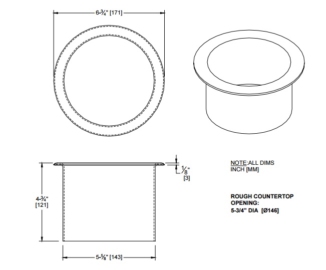 Stortkoker inw. 143mm. H=121mm. Inw/rand geslepen. Rand voor opleg, uitw 171mm.