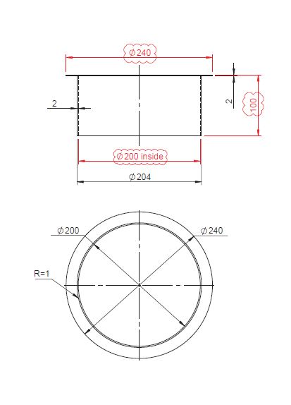 RVS stortkoker, inwendig 200mm. Hoogte 100mm. Inwendig rand geslepen.t.b.v. interieurbouw, vlakke inleg geschikt. Uitw. 240mm