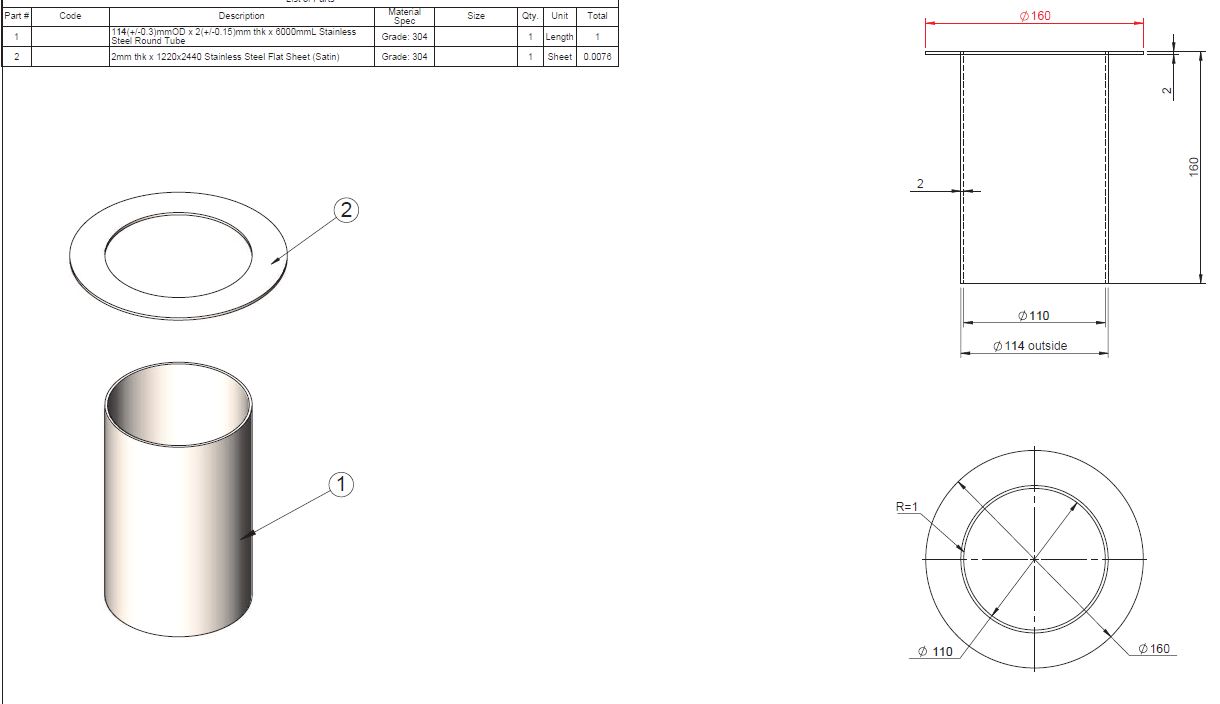 BAJ110160 RVS 304 stortkoker inw. 110mm. H=160mm. Inw/rand geslepen - doorvoer