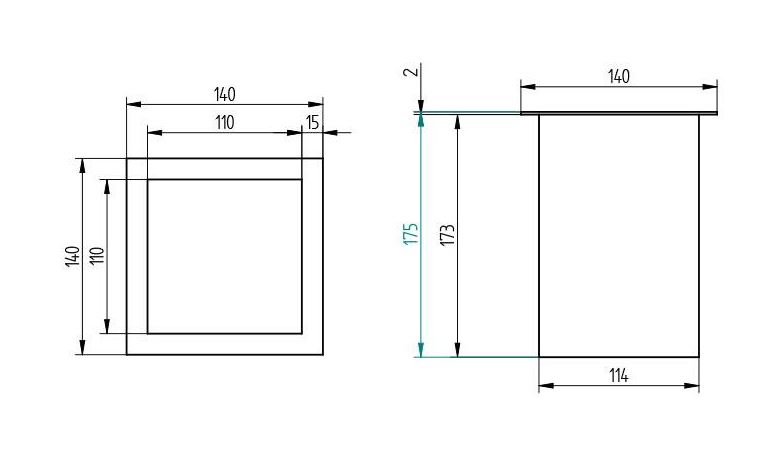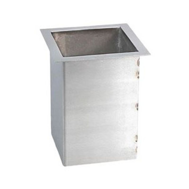 Materiaal: geborsteld RVS AISI 304, dikte 1,5 mm. Voor vlakke inbouw in werkblad of selfservicemeubel. Volledig gelast en gepolijst voor optimale hygiëne. Vlakke flens (breedte 15 mm) Uitw. afm.: 140 x 140 mm. Hoogte: 175 mm