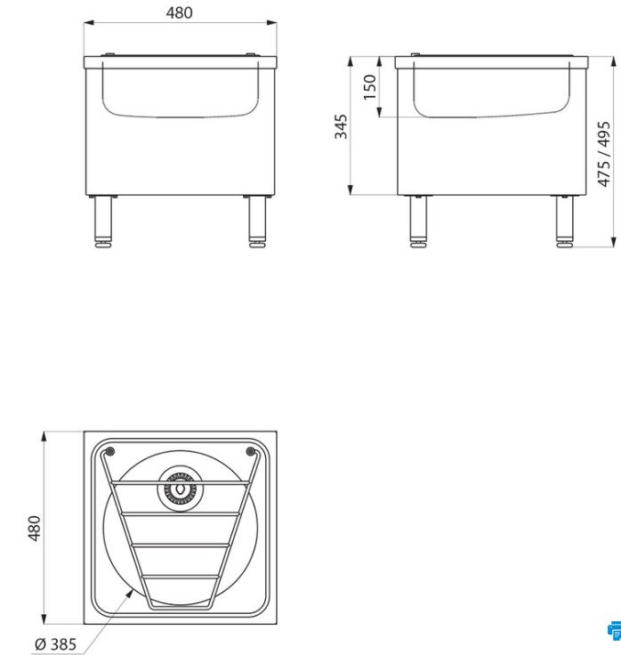 180150 RVS 304 staande uitstortbak uitw 480x480x495mm