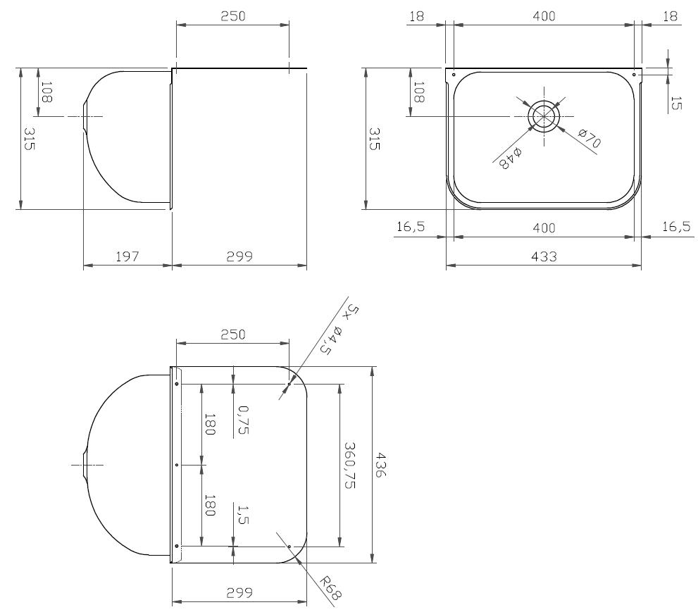 RVS Uitstortbak met emmerrooster, 1,5" roosterplug, 1 middenconsole en spatplaat 299mm hoog. Afm. 433x315x197mm.