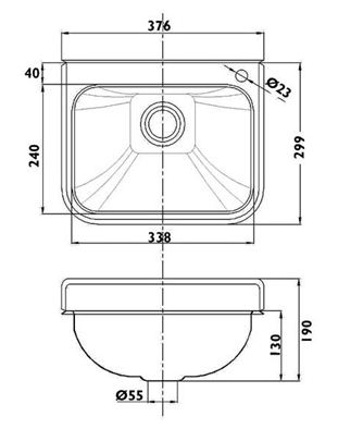 RVS spoelbak, 1,5" roosterplug, spatrand 60mm hoog. Afm.380x310x150mm. Geborsteld. Hoogte spatwand: 60 mm. Afvoerplug 1 ¼” met licht gebold gaatjesrooster Ø 65mm, incl. sifon, zonder overloop.