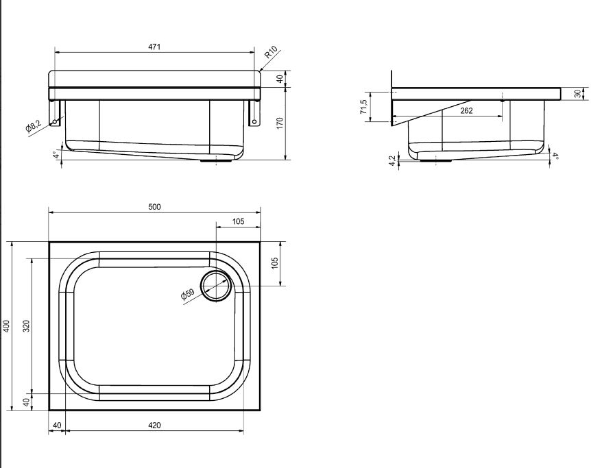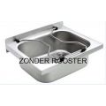 RVS 304 uitstortbak voor wandmontage ZONDER emmerrooster. uitw. Afm. 500x400x170mm, inw. 420x320x170mm. Incl. 1,5" afvoerplug.