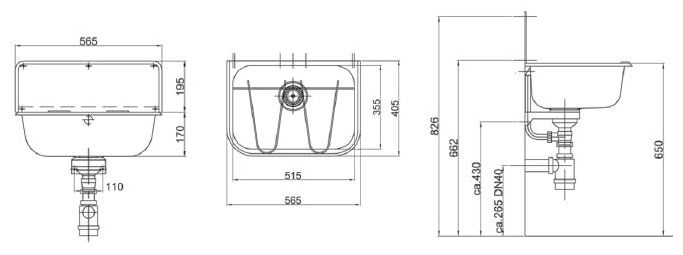 Uitw.B 565 x D 405 x H 365 mm, inw. B 515 x D 355 x H 170 mm. Korf-afvoerplug 1 ½” met uitneembare RVS zeef Ø 80mm, incl. overloop, overloopgarnituur en sifon. Materiaaldikte 0,9mm.