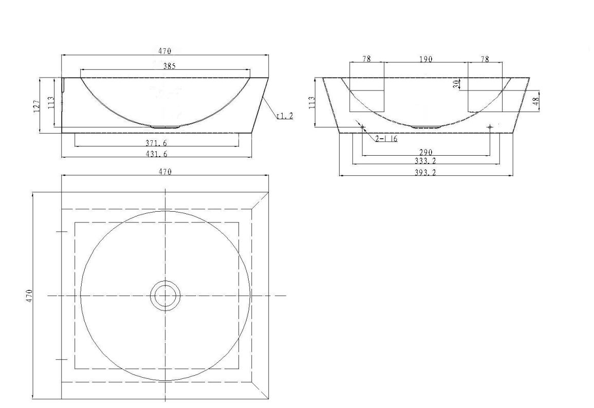 Vierkante square muurwastafel Square wandmontage, afm. 470 x 127 x 470 mm Waskom: Ø 380mm, diepte 116mm. Afvoerplug 1 ¼” met licht gebold gaatjesrooster Ø 65mm, incl. sifon, zonder overloop.