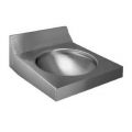 Wastafel voor wandmontage; geïntegreerde schuine spatwand van 90 mm hoog; ronde waskom. Geborsteld. Buitenmaten: B 550 x D 600 x H 210 mm. Waskom: Ø 385mm, diepte 135mm Afvoerplug 1 ¼” met licht gebold gaatjesrooster Ø 65mm, incl. sifon, zonder overloop.